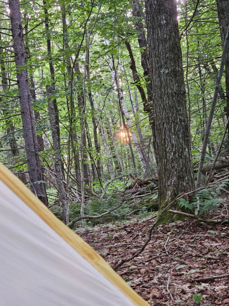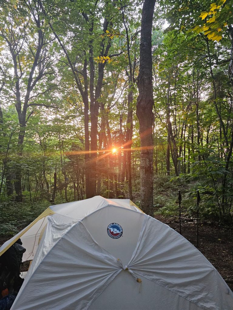 The wind gusted violently all night long. While the tops of the trees above us shifted and shook, not a breath of wind breezed by our tent. We were in a vacuum of stillness. It was a little eerie. This kept us warm, too warm, for the most part. But, opening the fly for more airflow meant letting in the noise of nature’s leaf blower, and I lost my earplugs.