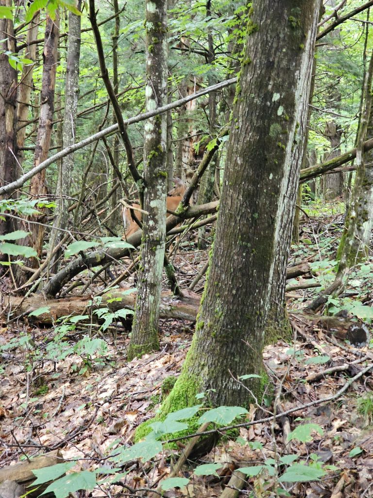 At one point, a flash of rusty brown fur and a white tip tail crossed the top of my vision (while staring at my feet, of course). The west coaster in me immediately stopped and thought, mountain lion. Shit, it’s doubling back on us! Once I came to a full stop, I could see that it was a small button buck deer. It was now doing its best to be invisible and looking at us with curiosity. For proof of fur, I clumsily snapped a picture, and we went our separate ways. Finally! A furry animal! They do exist out here.