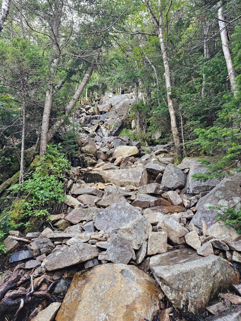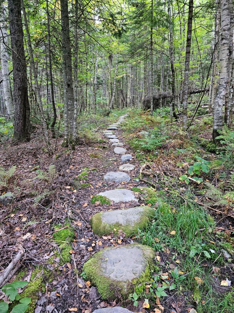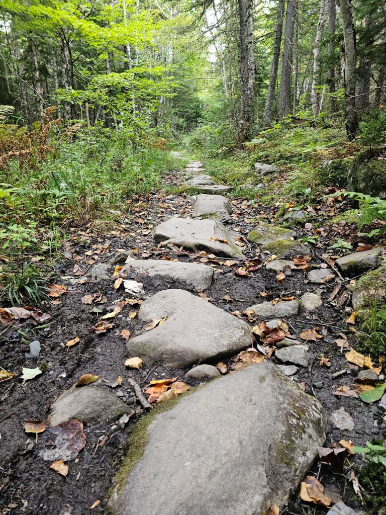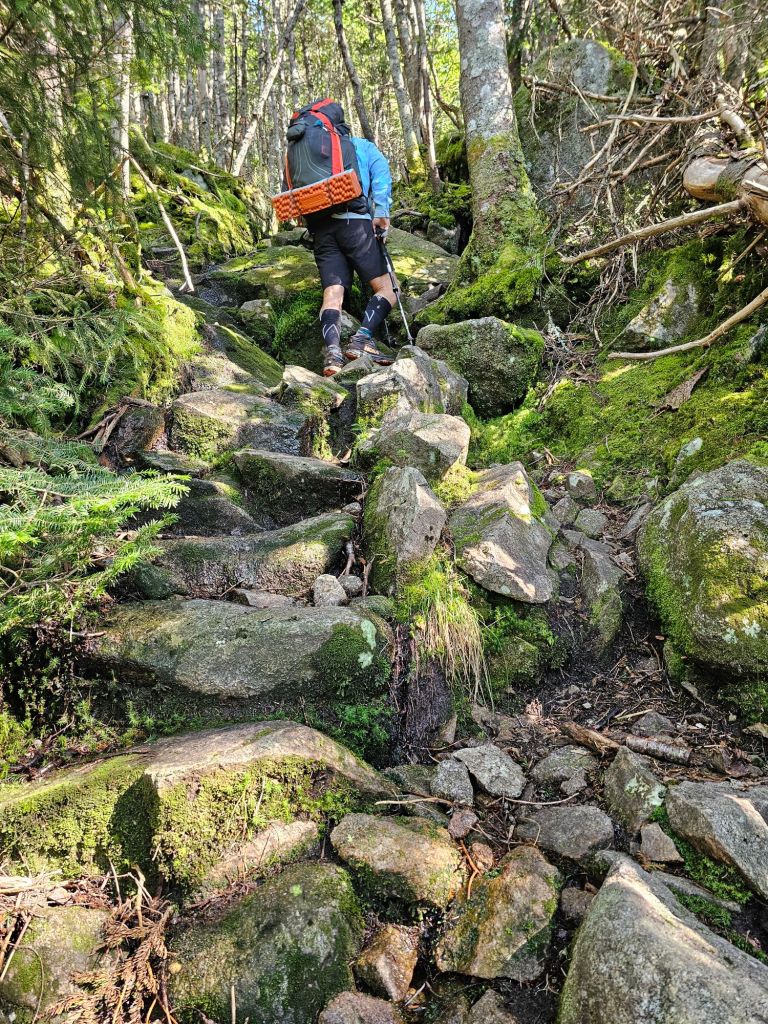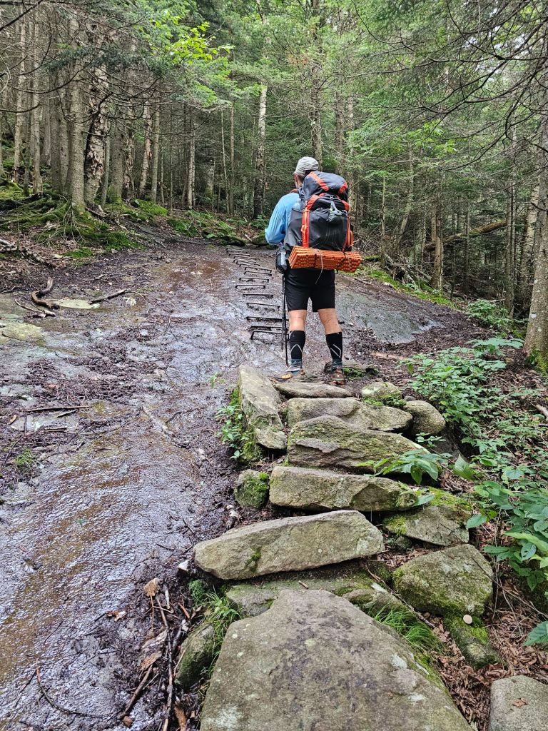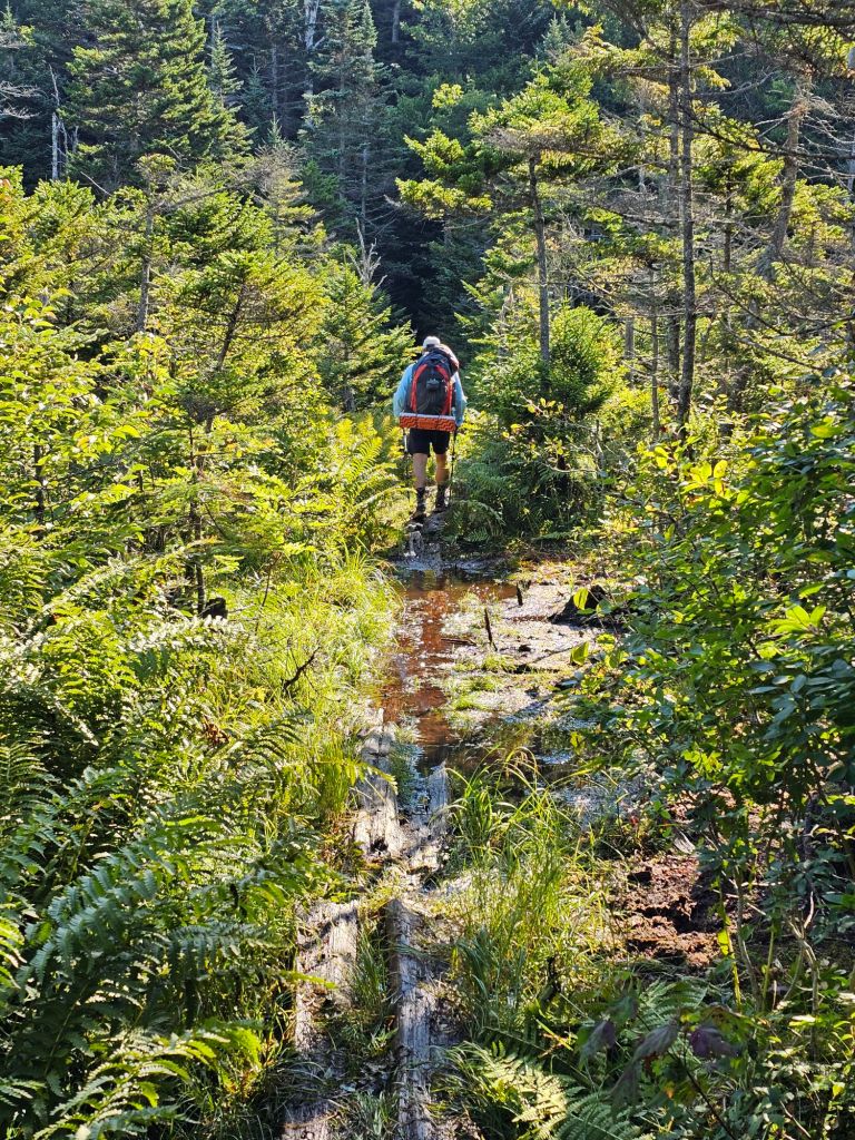 After chugging a quart of chocolate milk and a packet of oatmeal, it was time to hoist our packs and load into the shuttle. It was 7 a.m. and we were off, once again, to Kinsman Notch to start NOBO to Lincoln NH. The morning was almost brisk, and the humidity was seemingly nonexistent. What a blessing, as today would be mostly up. We would traverse over rocks, roots, submerged bog boards, and mud.