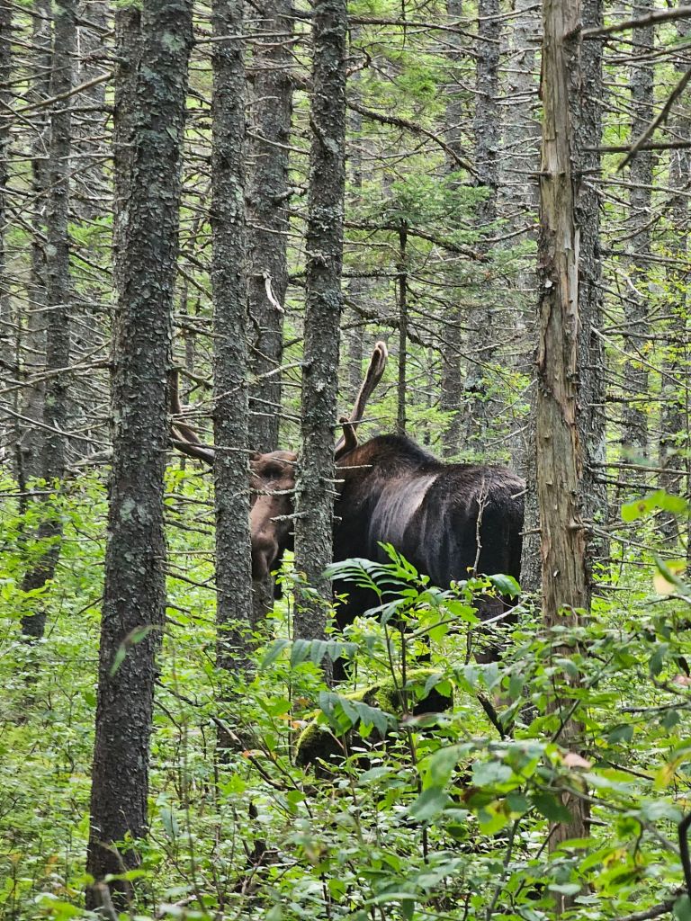 The trail to the 302 hwy was reported to be the easiest walk so far on the Appalachian Trail. While it was unusually easy tread a majority of the way, there were a few times when it returned to its “regularly scheduled trail,” of unorganized boulders and dilapidated and/or submerged bog boards. While examining our current soakers in the mud, we noticed what appeared to be a fresh set of moose tracks. And what did our wandering eyes spy, but a bull Moose not more than 25yds from us.