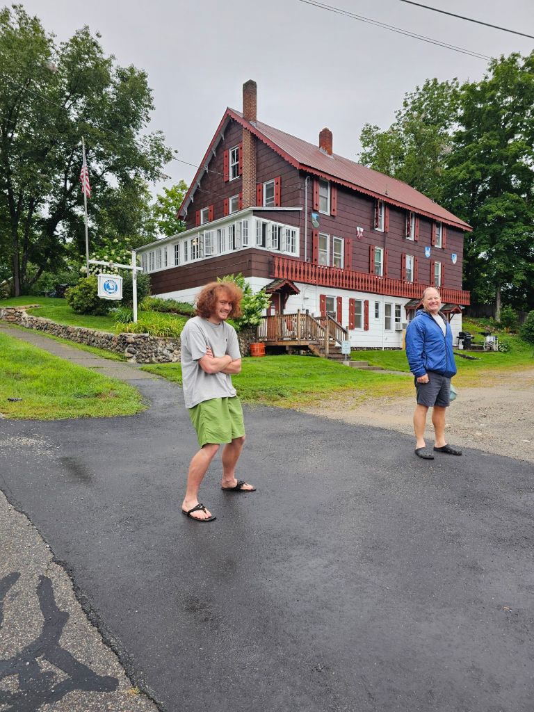 Two mountains climbs were on the menu for the day. South Kinsman (4358 ft.) and North Kinsman (4293 ft.), neither of which provided a unobstructed view of anything. If it did, it would only be an endless array of the tops of trees. We did pass by our first AMC (Appalachian Mountain Club, but most comments on FarOut refer to it as the Appalachian Money Club), and wow! Nothing like a large lodge in the middle of nowhere, perfectly situated by a small lake. We figured the 4 mile hike to the parking lot couldn’t be that bad if there were little kids bouncing around the lodge. Oh, it was that bad, probably because we were super tired from our seemingly neverending parkour course. In my exhaustion, I managed to allow an errant tree branch to attack me yet again along the length of my right forearm, which made for a bloody mess. If figured it would be best to let it bleed, and for giggles, I wiped it on a tree trunk or two for the muggles to wonder about. Just as we make the turn to the “blue line” toward the Liberty Spring parking lot, it starts to rain. We are good for now, as the tree canopy keeps us mostly dry. We are doing our best to sync our arrival to the parking lot with our shuttle to the Old Colony Ski Club and stay as dry as possible. Our plan is to zero, in Lincoln at the Old Colony Ski Club. As it starts to pour proper, Jen comes racing into the parking lot. She is one of the ski club key members, along with Jeff, who helps run the club as a hostel in the summer for Appalachian Trail hikers.