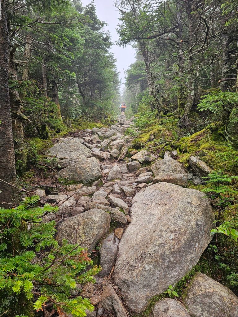As we walked we kept waiting for the trail to degrade fully, but it never really did. Even the .5 mile 700ft descent had a manageable grade and steps. We’ve noticed a bit of a trend when walking the AT that shares it route with paths to the AMC Huts. They tend to be fairly “tame”. There is just enough “trail ” to make it feel rugged.