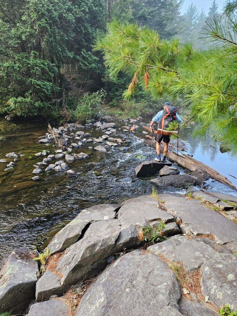 The tread was accommodating, at first, providing us with mile upon mile of perfectly lined stepping stones, indicative of how waterlogged and muddy this section normally is. We felt blessed to have caught this section on an “abby-normal” day. This didn’t mean that we didn’t get away “un-wet.” While the forecast was good, the actual weather for this area was a bit “undecided,” requiring us to break out our rain jackets and pack covers. My knee was becoming a bit unhappy with the “stroll” along a winding stream and the continual mud encased rock hopping, so we explored and pieced together an alternate. As with all creative alternates, there was a price to be paid. In this case, it was the crossing of a deep stream where a bridge had been washed out. We bushwhacked through thick shrubbery (pretty sure it was accented with poison ivy) and down a steep Ravine, followed by a precarious crossing that led to a “walk em dry” situation. With that completed, it was all a matter of finishing the miles into town.