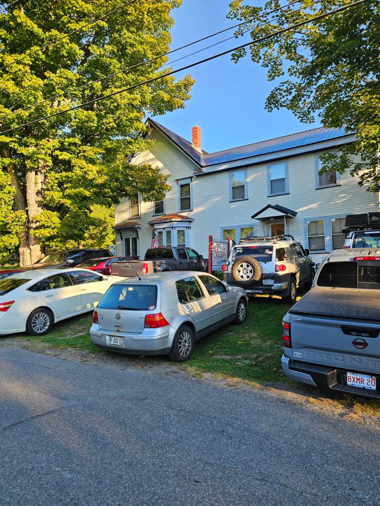 Once at the Grafton Notch, it took us a matter of 3 minutes to get a hitch into Bethel, Maine. A nice couple on the way to visit her mother gave us a lift and took us not only to the outfitters, but gave us great Intel on the layout and history ( land granted to settlers who fought to “conquer ” Canada in 1690’s) of our destination of Bethel, as they drove us toward town. One thing they have is roadside “stands” selling produce, or even baked goods! No one is tending the stand, so any purchases are via honor system for the items you take…cash or venmo. We stopped at a pie stand and purchased fresh maple moonpie cookies. At the outfitters we were able to find everything we needed (new socks, pack covers, mountainhouse, a new filter cartridge – #3 so far), to include “Franken Pole” parts to fix my broken trekking pole. After a quick tour of town and lodging options, they dropped us at what has been the best burger joint so far this thru-hike. Butcher Burger. While there, we ran into two other hikers we have been leap frogging with, Long Island and Cheddar. They were staying at The Knoll Hostel, and the owners had lent them their car to run errands. The Knoll was full for the night, so we booked with them for a Zero for our next day. For the night, we ended up in a classic New England bed and breakfast (who regularly accepts AT thru-hikers), The Holidae House B&B. Great room (with an actual bathtub) and fabulous breakfast. It was centrally located in this very walkable 4-season town next to the post office and grocery store.