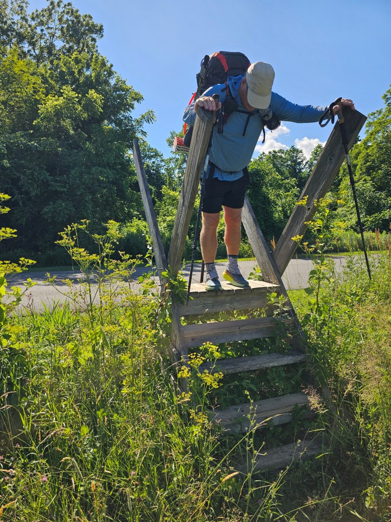 After devouring only half of the sandwich, which believe me, was more than enough, we packed away the other half and hit the road for our final mileage to our start of the Appalachian Trail. Of course, the start to the trail began with an uphill. Havent hiked a trail, so far, that doesn’t. The trail followed a mowed path and over wooden ladder fences. It was still a bit warm and somewhat humid, but not difficult. We had 2 liters of water with us to drink, but in hindsight, were pretty certain we not fully hydrated as we should have been to start.