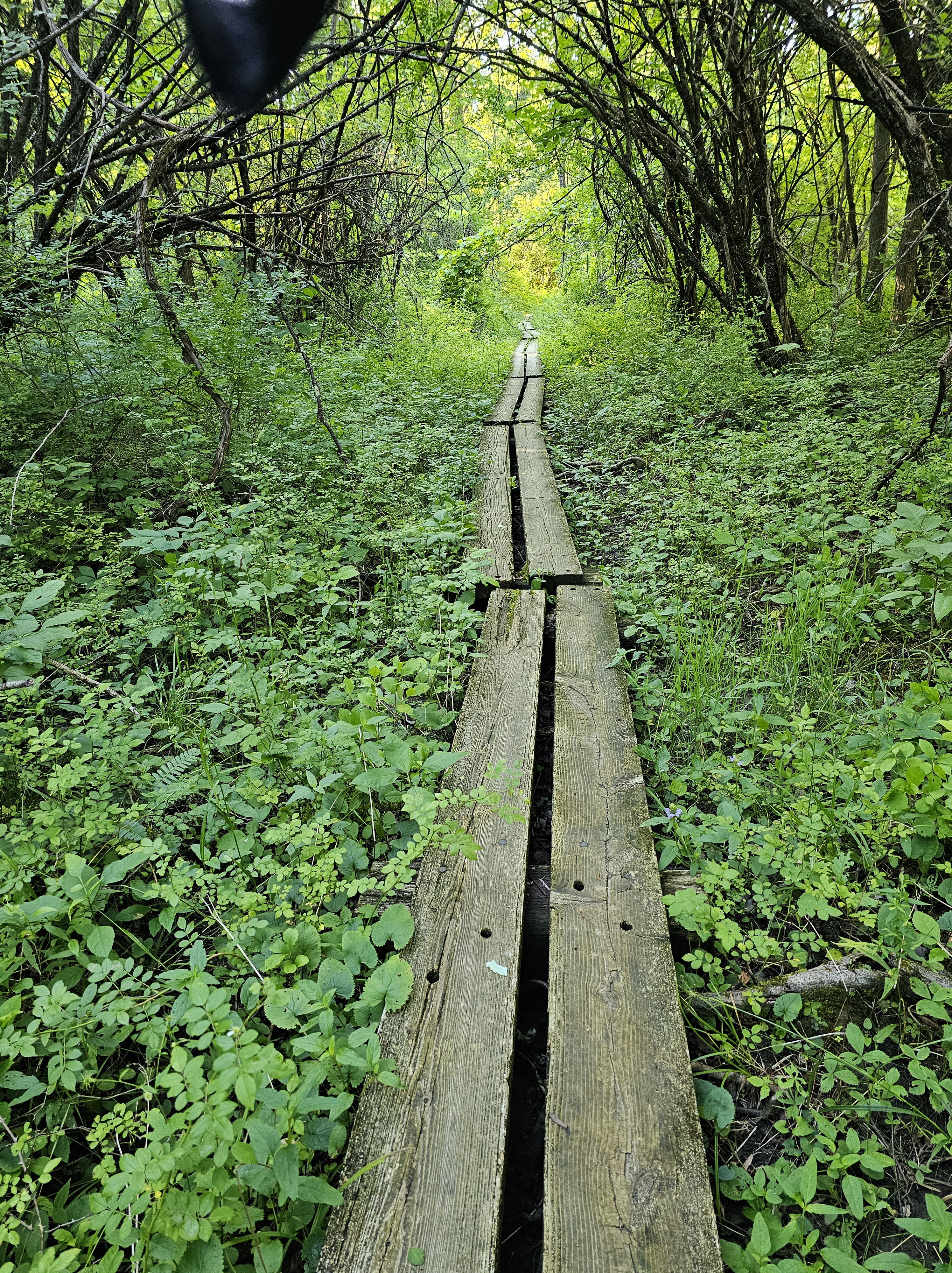 We traversed a field, where yellow finches took flight in droves of cascading waves as we passed. Our climb soon entered a green tunnel of overgrown vegetation. I do believe we are ahead of the “bubble”. Overgrowth turned to a series of wooden boardwalk paths atop muddy and marshy terrain, then back to dry roots and rocks.