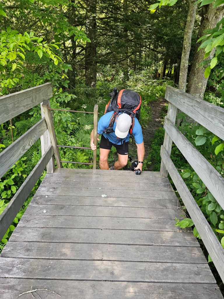 If it wasn’t for the uphills there’d be no downhill, and boy were there plenty today. Straight uphill, followed by straight down hill in humidity like we’ve never experienced. One could get heat exhaustion, if not heat stroke, if they’re not careful. Luckily, the water is as plentiful as the rocks and roots on this trail.