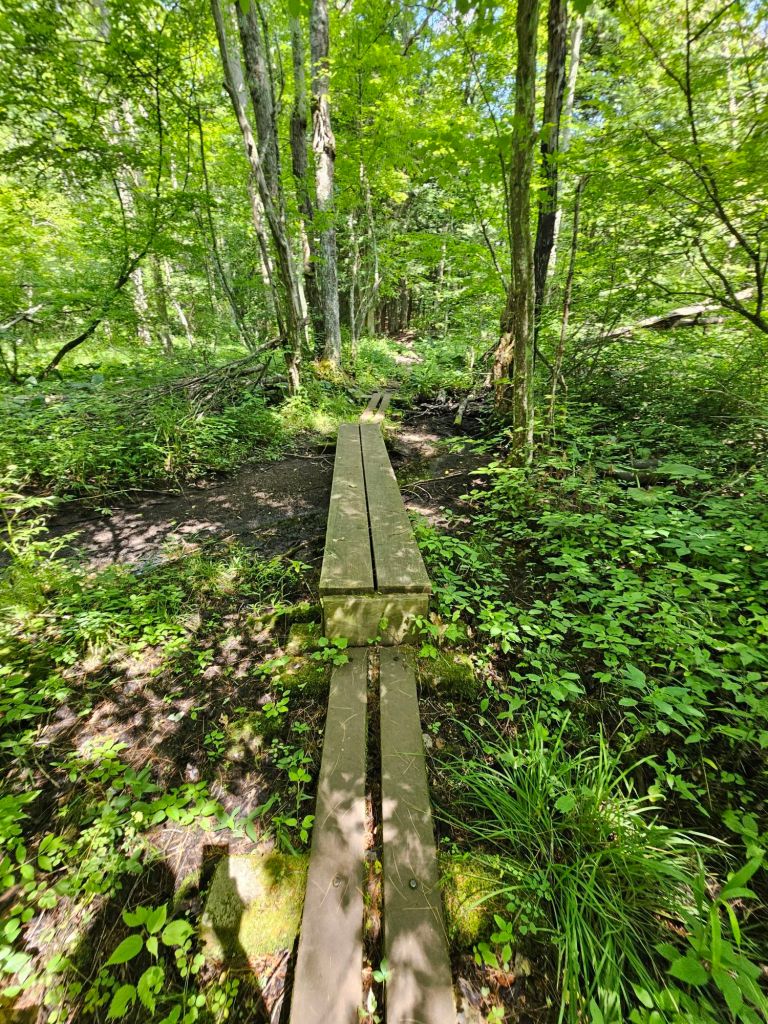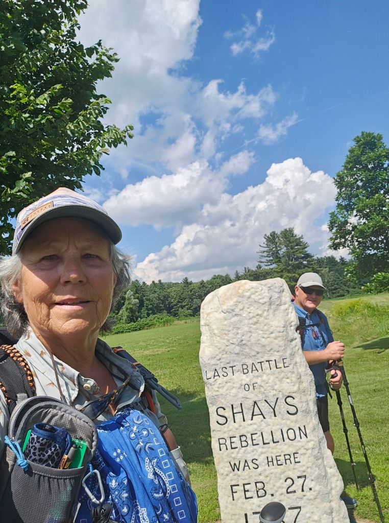 Timing is everything sometimes with thru-hiking, for as we pulled up under the shade of a large tree between the barn and several buildings, and we’re greeted with, “Sit anywhere you like. You can get water from the hose or inside. Would you like a popsicle?” All’s I can say is God is good…All the time. This was way better than a cheese burger. Who knows what we would have done if those kids hadn’t passed by. Most likely, we would have approached a house and asked for water or perused our FarOut app a little more thoroughly. Once sufficiently cooled down and watered up, we continued down trail upon raised boardwalk across a swampy area. We traversed through the location of the historic “battle” of Shay’s Rebellion and eventually reached Hwy 7.